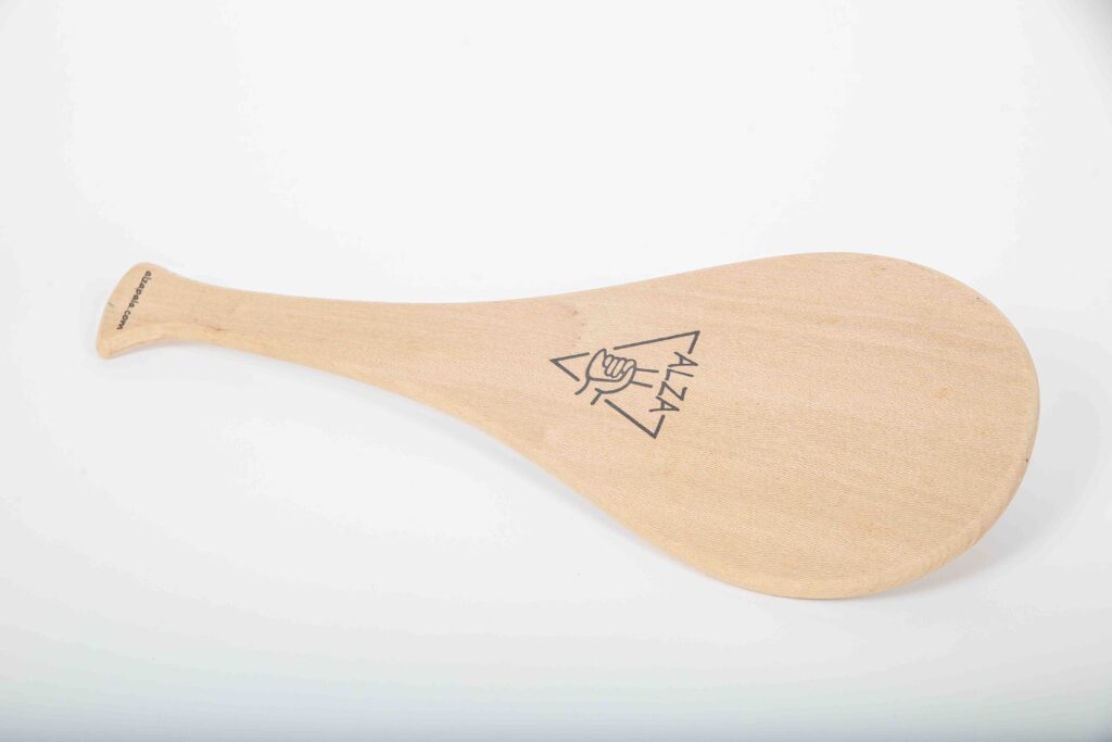• Raquette : large et épaisse, fabriquée en bois dur, elle mesure environ 50 cm mais sa largeur atteint 20 cm, ce qui offre une grande surface de frappe.